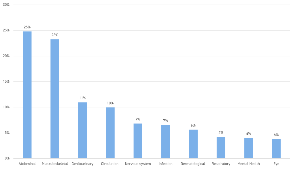The majority of illness claims we see are due to abdominal pathology, however this category contains a wide variety of diagnoses. Within the overall abdominal category, we see the highest number of claims relating to appendicitis (18%), haemorrhoids (16%), and hernias (14%). These more common varieties are explored in more detail below: